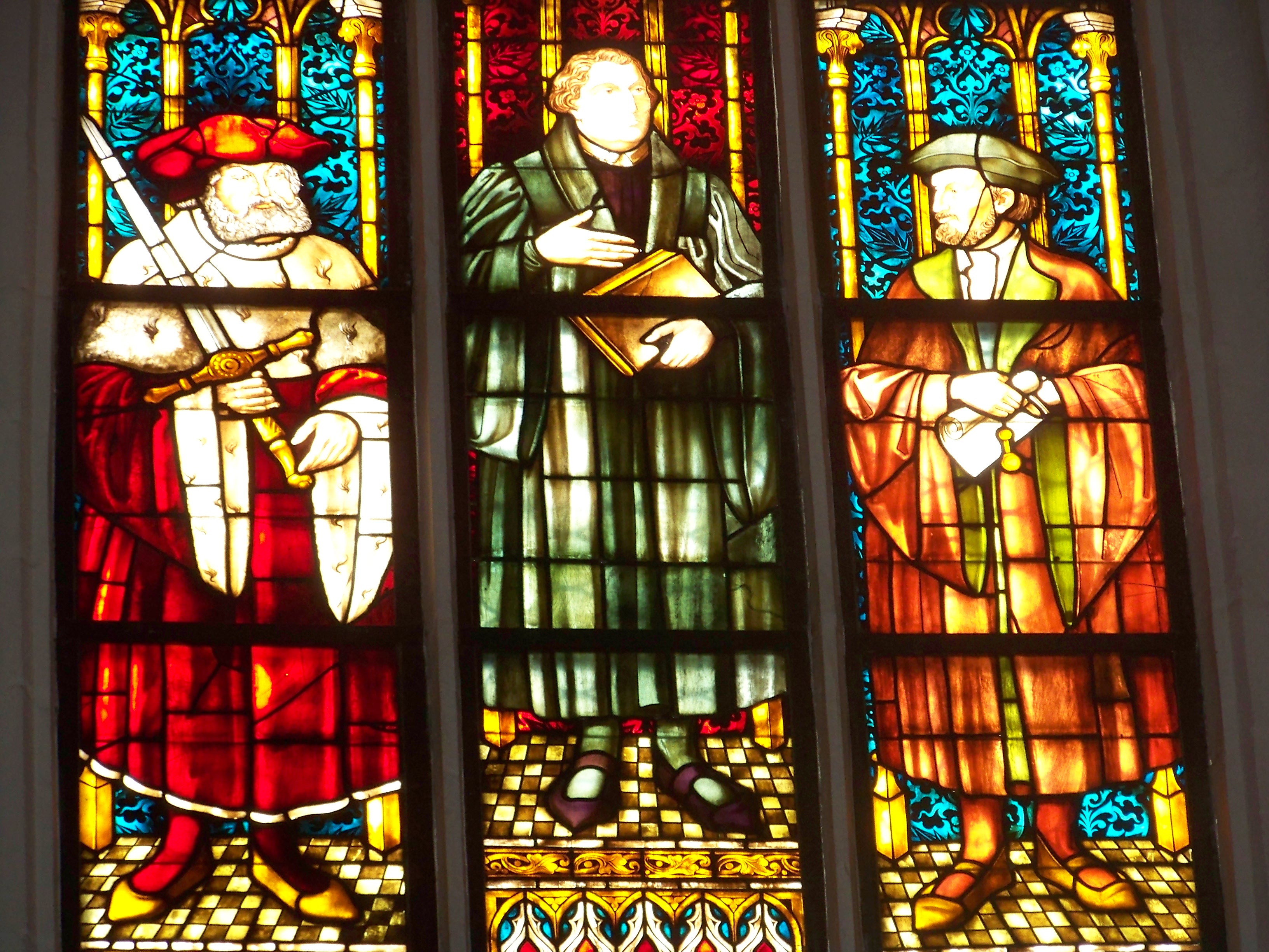 Dieses schöne Kirchenfenster in der Thomaskirche zeigt Martin Luther, Kurfürst Friedrich den Weisen und Philipp Melanchthon.