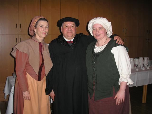 Am zweiten Tag der Hochzeitsfeierlichkeiten gab es einen grandiosen Festumzug. Anschließend begab sich das Brautpaar ins Schwarze Kloster, wo eine Hochzeitstafel aufgebaut war. Mägde führten ein kleines Stück auf, Spielleute und Spaßmacher sorgten für viele Lacher, und Renaissance-Musiker und -Tänzer sorgten für das richtige Flair. Es war wirklich ein Erlebnis. Ich stehe hier mit dem hohen Brautpaar im Hofe des Schwarzen Klosters vor dem Katharina-von-Bora-Denkmal.