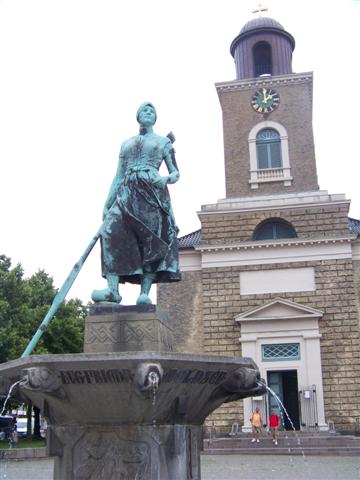 Am 23. Juli 2009 besuchten Bianca und ich Husum. Dies ist der berühmte Tine-Brunnen, dahinter die Marienkirche, in der Hermann Tast predigte.